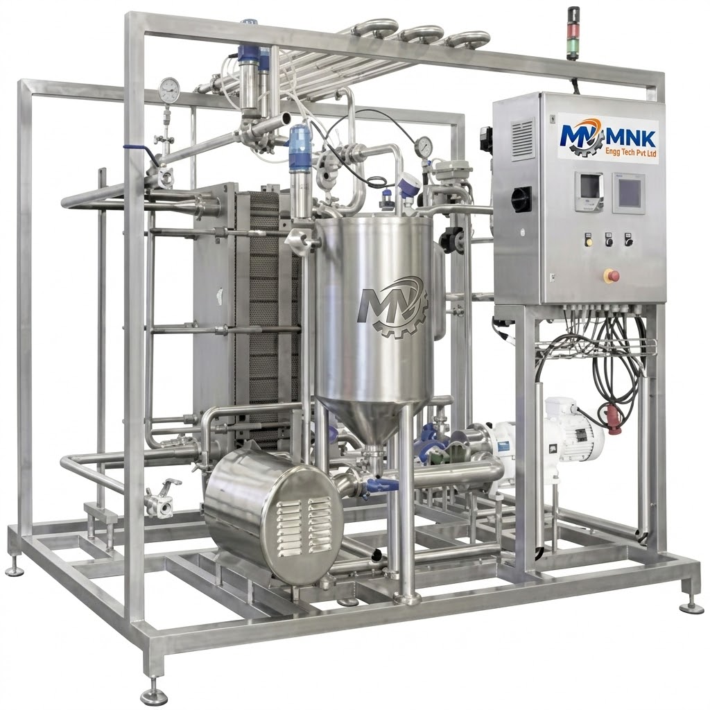 A Milk Pasteurizer is a dairy processing machine designed to heat milk at a controlled temperature to eliminate harmful bacteria while preserving its nutritional value, taste, and quality. It ensures safe and hygienic milk processing for dairy plants.